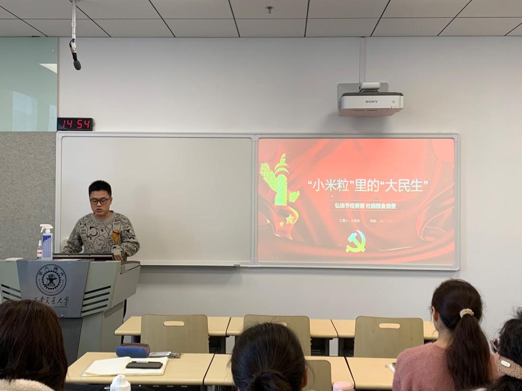 11月24日下午,化学学院新生支部委员会在19号楼5110教室召开专题组织生活会。深入学习贯彻党的十九届六中全会精神和《粮食节约行动方案》。通过学习支部党员深入理解党的十九届六中全会精神的重大意义、丰富内涵和核心要义。同时,采取积极措施号召同学们一起为降低粮食损耗,减少粮食浪费,坚决刹住浪费粮食的不良风气做出贡献。会议由支部书记王鹏程主持。