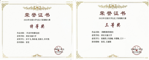 8月中旬,2025年全国大学生化工短视频大赛在华侨大学圆满落幕。该项赛事由中国化工学会主办,以"专家评审+现场答辩"相结合的方式,强调科普传播与创新表达能力,共吸引全国63所高校的139件作品参赛。我院推荐作品《生活中的催化剂》荣获大赛最高荣誉——特等奖;《烟酰胺的秘密》获三等奖;指导教师张雯获"优秀指导老师"称号。