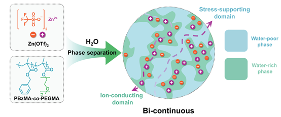 针对上述问题,西安交通大学化学学院张彦峰教授、明小庆研究员团队聚焦于水凝胶电解质微观结构调控,通过水诱导微相分离策略构建了具有双连续相结构的微相分离水凝胶电解质。基于两亲性聚合物中单体亲疏水性差异,以水作为诱导因子使得亲疏水链段分别聚集,刚性的疏水链段承担载荷,极大提升力学性能(模量达134.6 MPa);柔性亲水链段运动为离子传输提供通路,使水凝胶具有可观的离子电导率(1.46 mS cm-1)。基于该电解质的对称电池能够循环1100 h以上,Zn||V2O5全电池表现出高容量(0.2 C下278 mAh·g-1)、优异倍率与长寿命循环(5.0 C下循环1000次后容量近100%保持)。