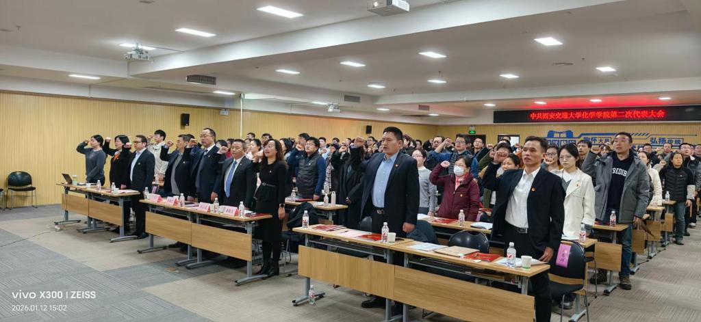 2026年1月12日,中国共产党西安交通大学化学学院第二次代表大会在兴庆校区仲英楼召开。西安交通大学党委常委、副校长单智伟,党委组织部副部长詹敬芳出席会议。化学学院党政领导班子、全体师生党员代表参加会议。会议由学院党委副书记潘兰主持。本次大会的主题是:高举中国特色社会主义伟大旗帜,以习近平新时代中国特色社会主义思想为指导,深入学习贯彻党的二十大精神,全面落实学校第十三次党代会部署,弘扬西迁精神,坚持立德树人,聚焦“四个面向”,凝心聚力,固本拓新,加快推动化学学科内涵式高质量发展,为早日建成特色鲜明、国内一流、国际知名的化学学科而努力奋斗。