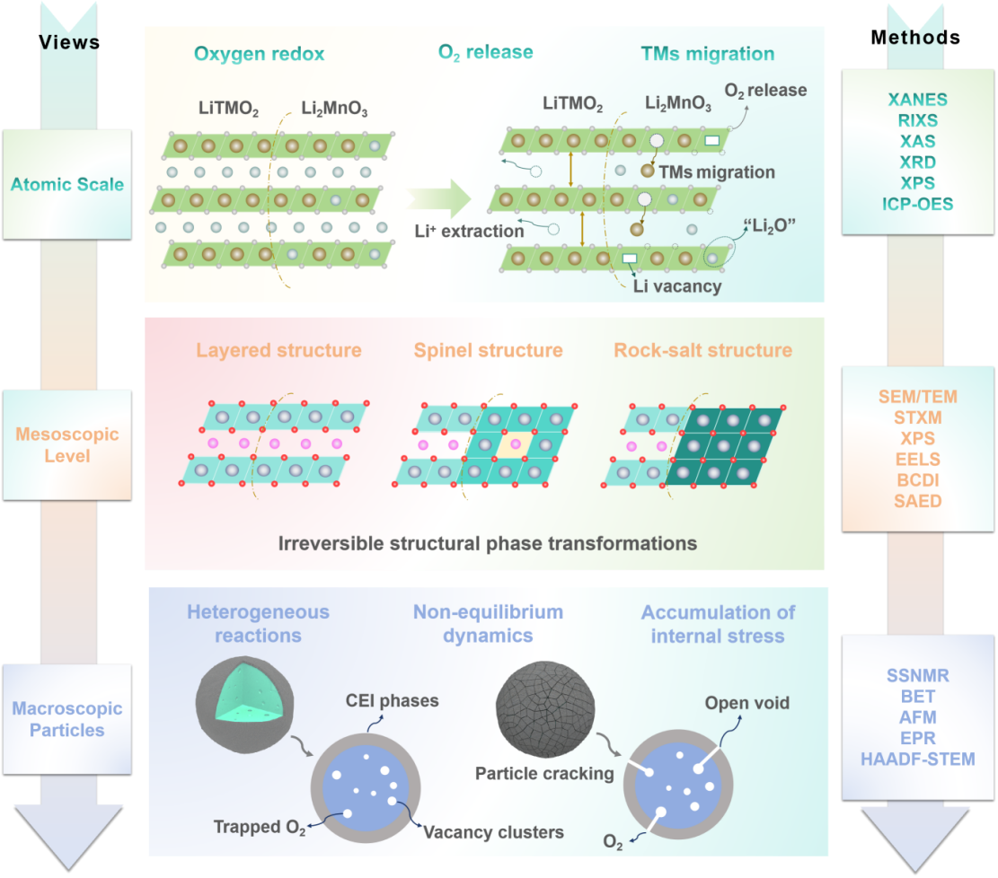 针对该领域瓶颈,西安交通大学化学学院郗凯教授团队对富锂锰基正的衰减路径进行了全面、多尺度的分析,涵盖从原子尺度结构动态到介观异质性及宏观颗粒演变的全过程。特别聚焦于解析氧阴离子与过渡金属阳离子氧化还原过程、氧释放、过渡金属离子迁移、不可逆相变、非均相电化学反应及工作条件之间的协同作用机制。通过整合先进表征、理论模拟和电化学分析的研究成果,文章构建了一个统一框架,以阐明氧活性、过渡金属离子动态和结构转变之间复杂的关联。这些机理认识为开发抑制电压衰减与容量损失的稳定化策略奠定了关键基础。最终,该综述弥合了基础机理认知与实际工程应用之间的鸿沟,为面向高性能储能系统、设计长寿命高能量密度富锂锰基正极材料提供了可操作的指导。