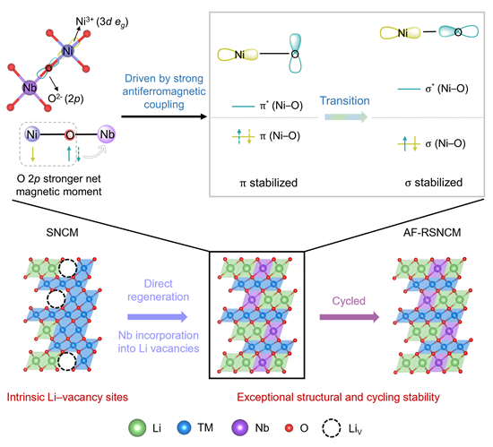 针对上述问题,西安交通大学化学学院郗凯教授团队提出了一种取向位点诱导反铁磁耦合以稳定再生正极材料的策略,利用废旧NCM正极中大量存在的本征锂空位作为取向位点,在废旧正极再生过程中选择性地将Nb原子引入Li位点。与传统的TM位点掺杂不同,Li位点的Nb能够有效调节桥接O阴离子的电子自旋取向和轨道分布,在相邻O阴离子和Ni阳离子之间触发强烈的反铁磁耦合。这种反铁磁耦合的建立,促使Ni–O轨道杂化发生了根本性转变,从不稳定的π键主导转变为稳固的σ键主导。增强的键合网络稳定了晶格骨架,有效抑制了循环过程中Ni的面内/面外迁移。实验结果表明,该策略获得的再生正极材料(AF-RSNCM)表现出优异的电化学性能,在0.5 C下循环750次后,容量保持率达60%。